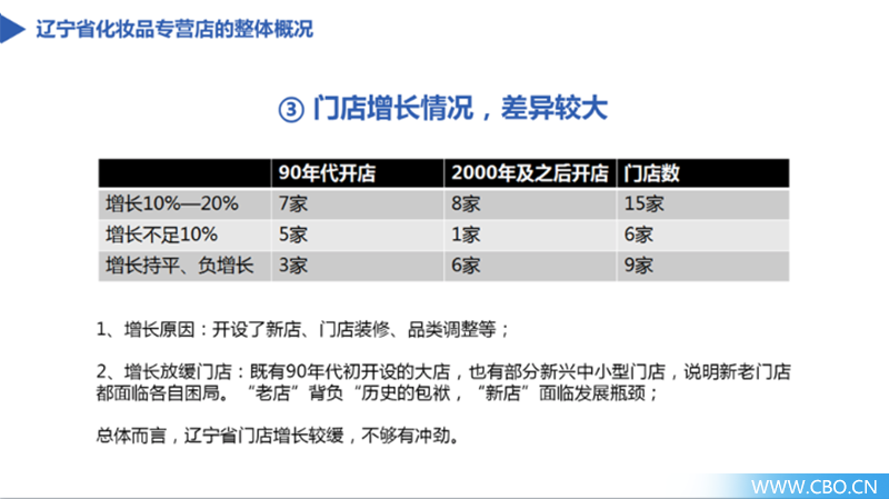 妍丽等全国知名购物中心店,已进驻辽宁省,但本地专营店对于购物中心店,暂处于“试水”阶段,竞争力不强。