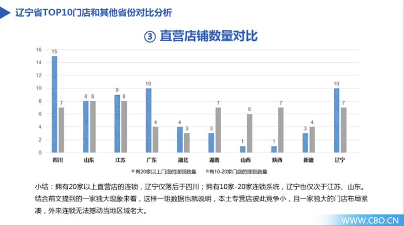 3、直营店铺数量对比,仅次于3个省份。拥有20家以上直营店的连锁,辽宁仅落后于广东;拥有10家-20家连锁系统,辽宁也仅次于江苏、山东。从这个角度来说,辽宁依然能够称得上是化妆品专营店大省,虽然没有走向全国的大连锁,但20家店以上的,已经具备规模性大发展的潜质。